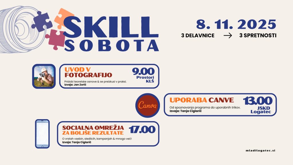 Mladinski svet Logatec vabi na SKILL SOBOTO – izobraževalni dan 8. 11. 2025, ki ga bodo sestavljale 3 različne delavnice, ki naslavljajo 3 različne spretnosti.
